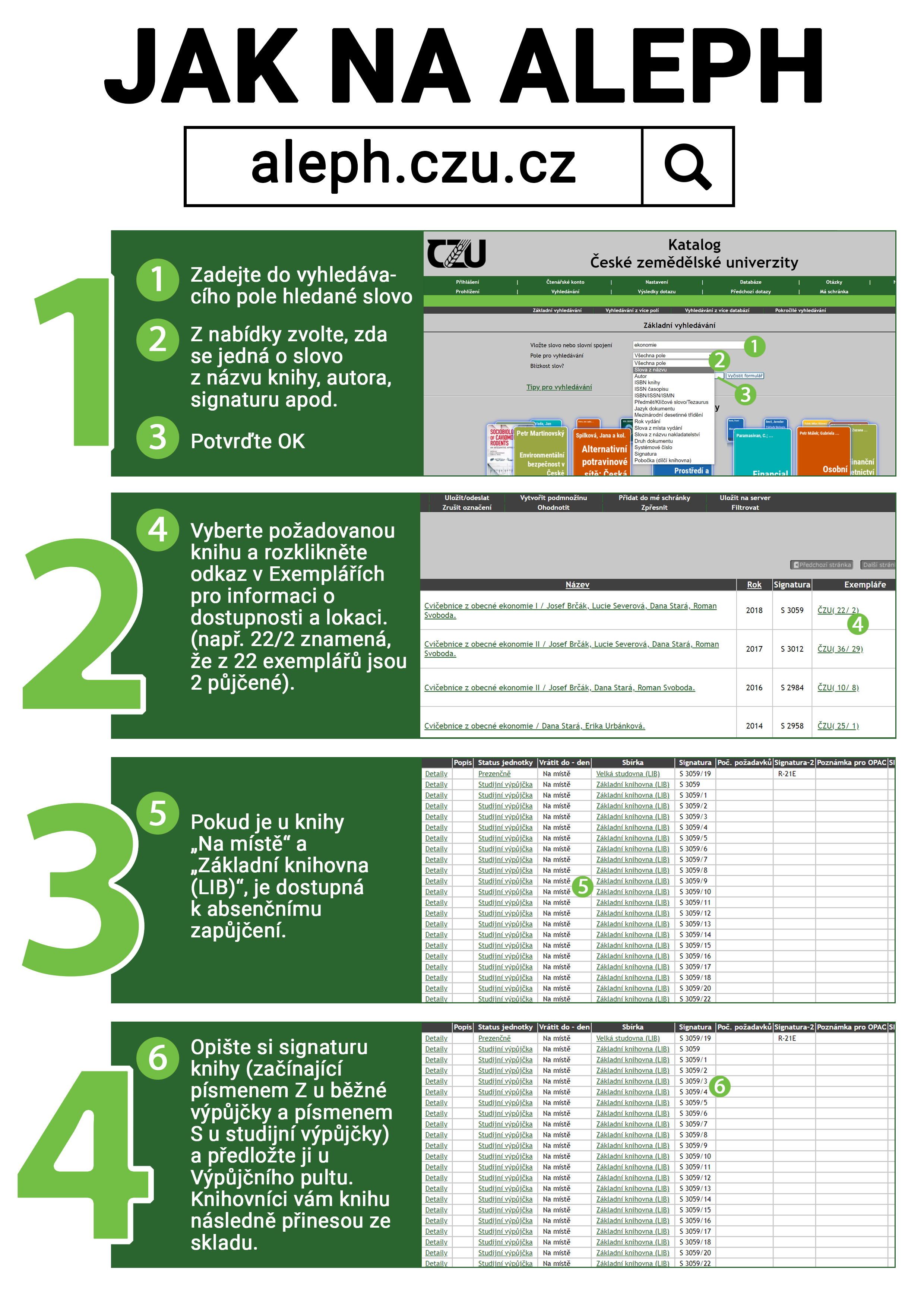 V knihovním katalogu Aleph najdete jak literaturu pro výpůjčky absenční (s sebou domů) tak pro výpůjčky prezenční (pouze v prostorách knihovny).