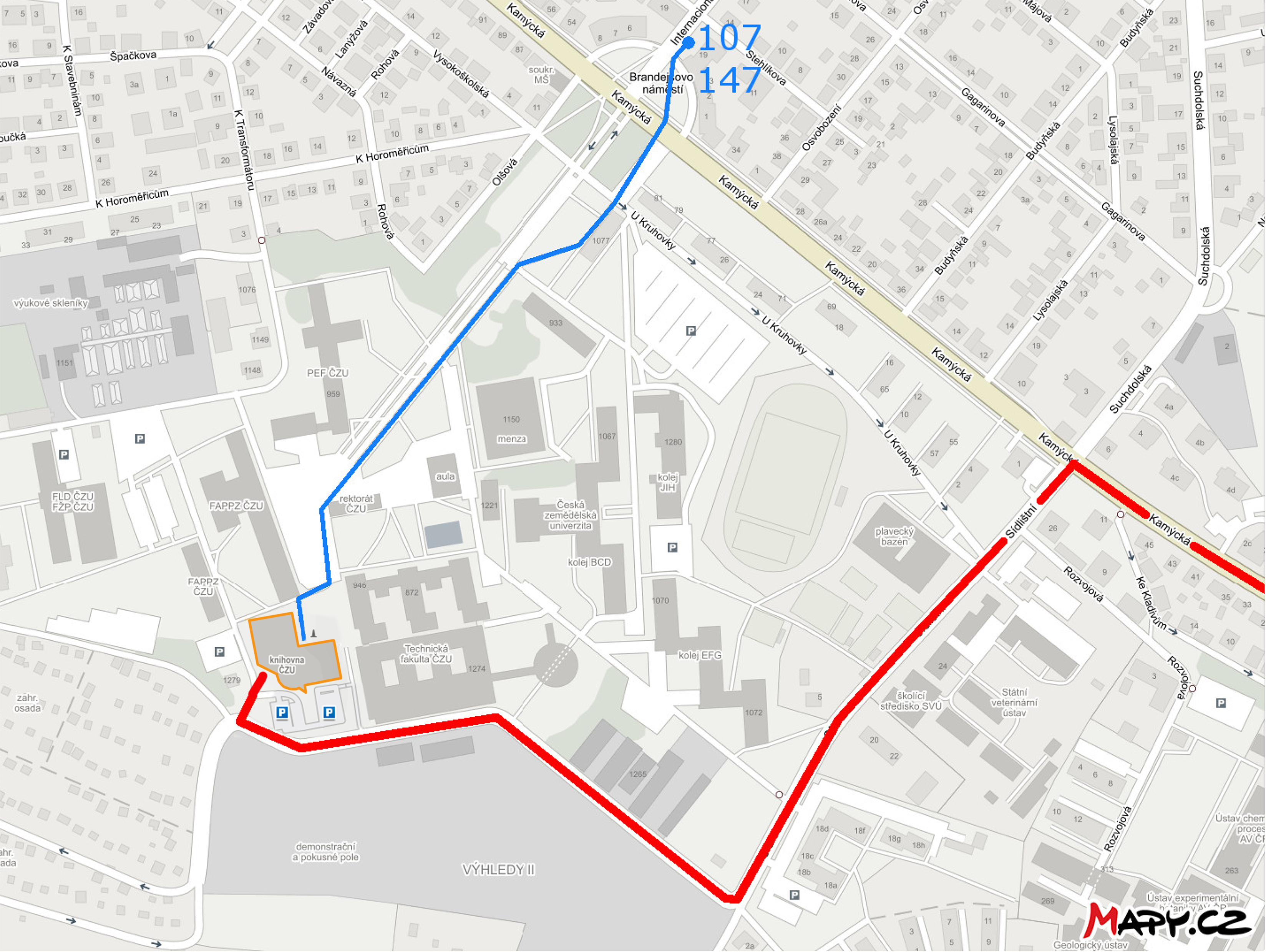 In the Dejvická station take the bus 107 or 147 and get off at Zemědělská univerzita stop. The ride takes around 10 minutes. To get to the CZU Library, please follow the blue track on the picture bellow.